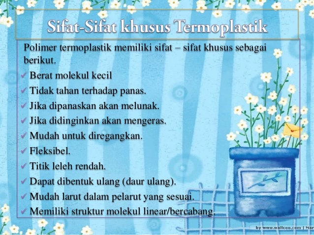 7. Polimer sherchemistry. Polimer yang termasuk polimer termoplastik adalah jenis polimer plastik. Jenis plastik ini tidak memiliki ikatan silang antar rantai polimernya, melainkan dengan struktur molekul linear atau bercabang. Makalah kimia polimer hamzahizers pad. Termasuk jenis polimer antara lain plastik, elastomer, serat, cat dan bahan pelapis. Penggunaan polimer dalam perkakas rumah tangga, alat transportasi, alat komunikasi dan alat elektronika sangat besar cakupannya. Mengenal berbagai jenis plastik rumushitung. Jenis plastik sebenarnya masih banyak lagi, tergantung jenis polimer penyusunnya. Masih ada polivinil asetat, polivinil alkohol, poliakrilonitril, alkin resin, asetal resin, dan sebagainya. Buat anda yang ingin mengetahui lebih banyak lagi bisa surfing di internet. Jenis jenis polimer dan kegunaannya. Polimer yang termasuk polimer termoplastik adalah jenis polimer plastik. Jenis plastik ini tidak memiliki ikatan silang antar rantai polimernya, melainkan dengan struktur molekul linear atau bercabang. Kegunaan polimer dan jenisjenisnya mastah. Nylon 66, juga disebut sebagai nilon 6,6, adalah jenis nilon.Nylon terdapat dalam berbagai jenis, dua yang paling umum untuk industri tekstil dan plastik adalah nilon 6 dan nilon 6,6.Nilon digunakan untuk banyak hal, seperti serat karpet, pakaian, airbag, ban, tali, selang, stoking, parasut, dll. 7. Polimer sherchemistry. Polimer yang termasuk polimer termoplastik adalah jenis polimer plastik. Jenis plastik ini tidak memiliki ikatan silang antar rantai polimernya, melainkan dengan struktur molekul linear atau bercabang. Bentuk struktur termoplastik sebagai berikut. Bentuk struktur bercabang termoplastik. Macammacam jenis plastik lengkap awalilmu.Blogspot. Plastik jenis ini biasa digunakan untuk membuat plastik pembungkus makanan, botol minyak sayur, dan mainan anakanak seperti pelampung renang. Selain itu juga digunakan untuk membuat pipa plastik, dan komponen kabel komputer. Berbagi ilmu proses termoset dan termoplastik. Polimer yang termasuk polimer termoplastik adalah jenis polimer plastik. Jenis plastik ini tidak memiliki ikatan silang antar rantai polimernya, melainkan dengan struktur molekul linear atau bercabang.